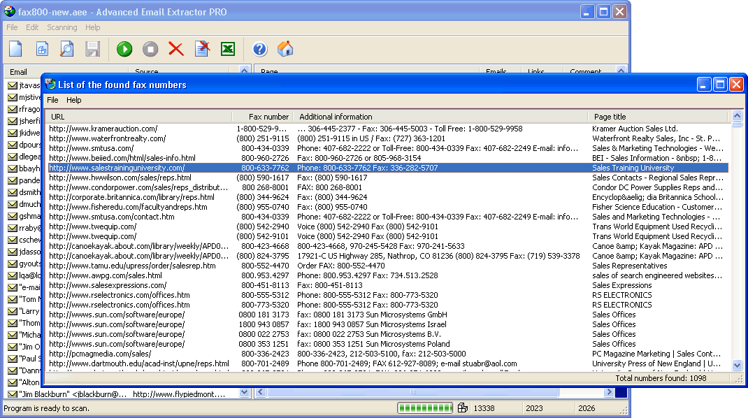 Email Extractor designed to extract email adresses, phone numbers, ICQ UINs and other data from webpages on the Internet and from HTML and text files on the local disks.