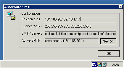 Normally, in that situation user has to get a e-mail address from a free mail server and use its SMTP server to deliver mail, though server of ones ISP ensures much faster and more convenient delivery. The problem is that one has two ISP's. Autoroute SMTP offers solution for that problem. The only thing you have to do is to enter one mail server with address localhost (or 127.0.0.1) in your mail client settings. Then, the mail client will establish connection with Autoroute SMTP, and Autoroute SMTP will automatically switch it to the right server.